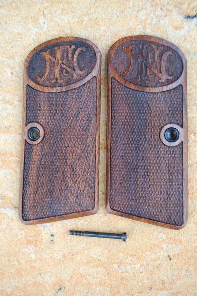 They are made from English walnut of the natural color, checkered with the "FN" logo, oil finished. The escutcheons are installed, a screw is included.